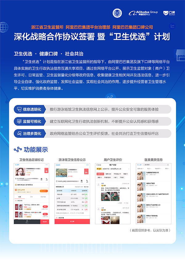 2018年4月18日,浙江省衛(wèi)生監(jiān)督所聯(lián)合本地生活服務(wù)平臺(tái)口碑,宣布啟動(dòng)一項(xiàng)名為"衛(wèi)生優(yōu)選"的計(jì)劃。基于政府衛(wèi)生執(zhí)法信息的開放,給包含游泳館在內(nèi)的生活服務(wù)商家,衛(wèi)生狀況達(dá)標(biāo)的,他們的線上口碑店鋪打"衛(wèi)生優(yōu)選"標(biāo)簽,并予以重點(diǎn)推薦。